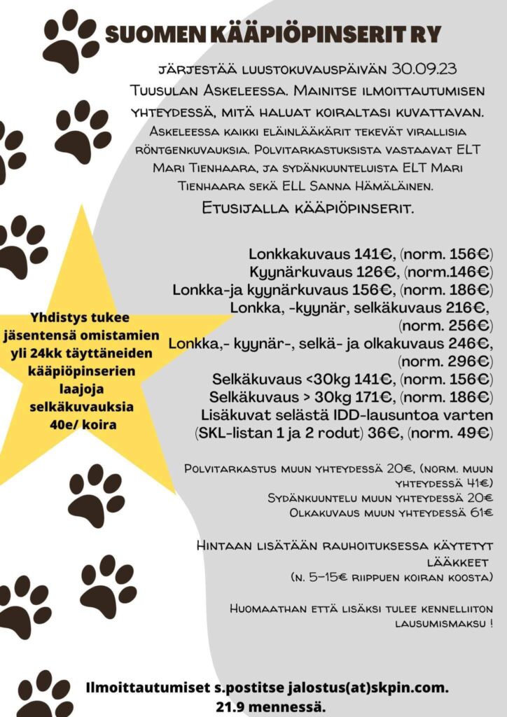 TERVETULOA KÄÄPIÖPINSEREIDEN MAAILMAAN! Suomen Kääpiöpinserit ry on valtakunnallinen kääpiöpinsereiden rotujärjestö. Jäseneksi voi liittyä kuka tahansa kääpiöpinsereistä kiinnostunut. YHDISTYSYhteystiedot - Säännöt - Kokoukset ROTURotuesittely - Luonne - Terveys JÄSENEKSILiity jäseneksi- Jäsenedut- Kasvattajaedut PENTUJASyntyneet - Odotettavissa - Kodinvaihtajat VIIMEISIMMÄT UUTISET Seinäkalenterit vuodelle 2026 5.12.2025 Rally-tokon rotumestaruuskisat 15.11.2025 26.9.2025 Koiratanssin rotumestaruuskilpailut 11.10.2025 26.9.2025 Agilityn rotumestaruuskisat 22.-23.11.2025, Vantaa 17.8.2025 Tokon rotumestaruuskisat 5.10.2025 14.8.2025 Syyskokouskutsu 25.10.2025 14.8.2025 Katariina Mäen rotuwebinaari 13.11.2025 4.6.2025