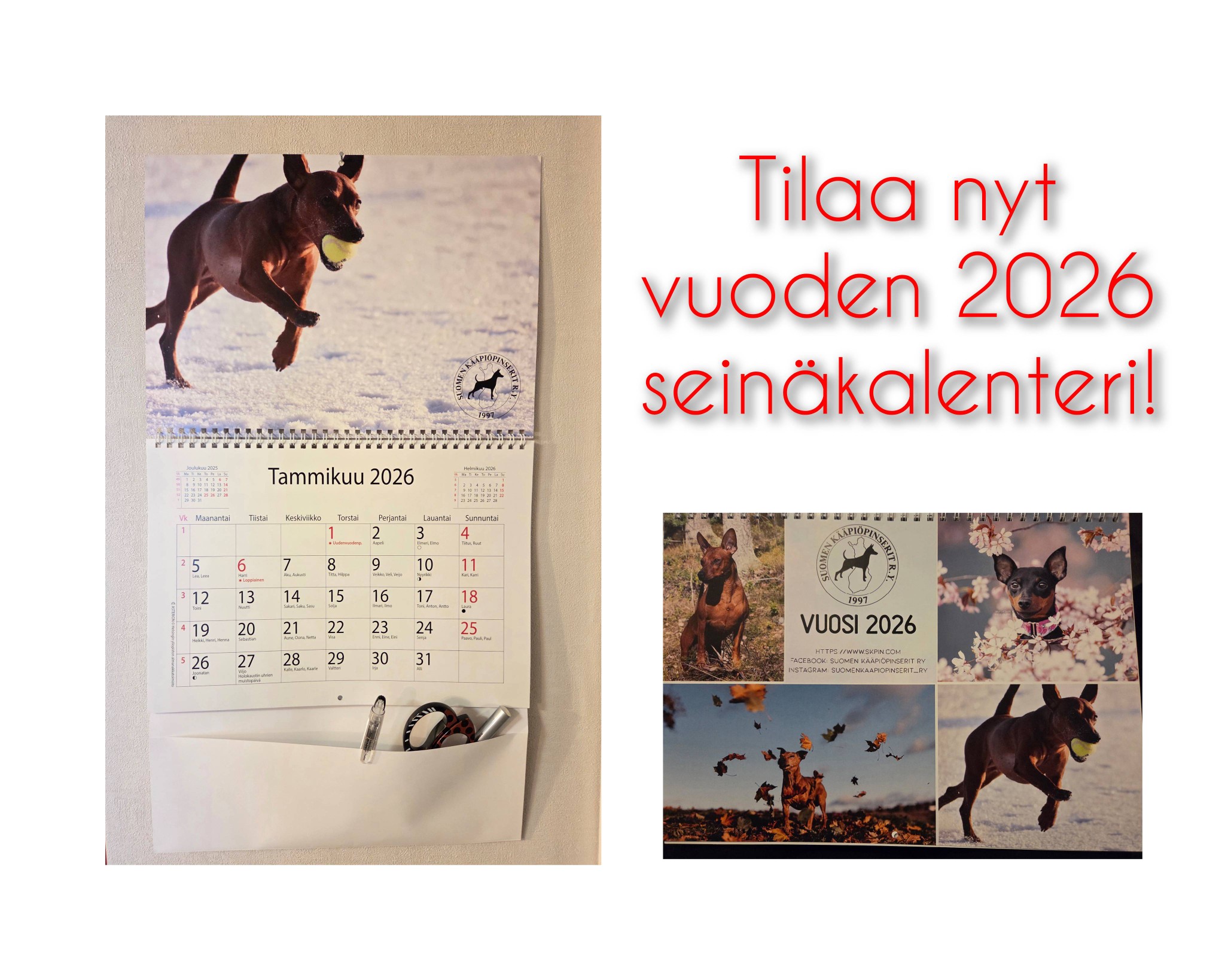 Nyt niitä saa, nimittäin SKPIN ry:n kääpiöpinseriaiheisia seinäkalentereita vuodelle 2026! Kuvat ovat jäsenistön lähettämiä ja jäsenet ovat saaneet äänestää niistä mieluisimmat kalenteriin. Kalenterissa on laskutasku, johon saa kätevästi vaikka kynät talteen!